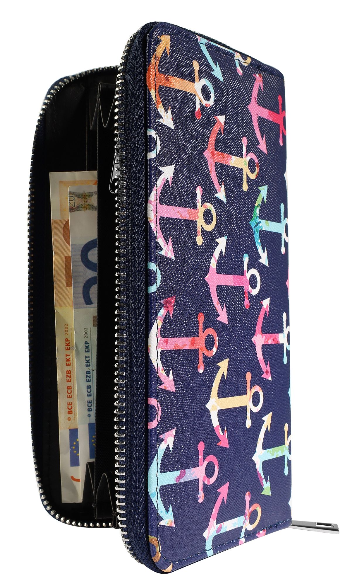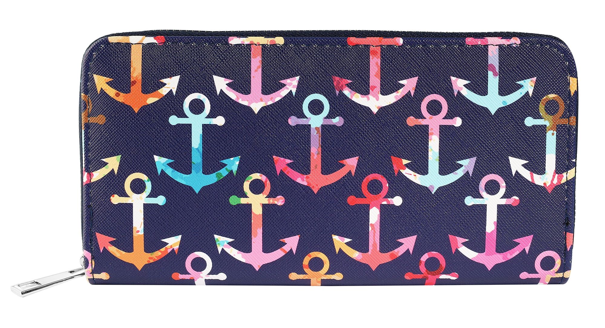 Productinformatie "Cham Cham Damengeldbörse aus Lederimitat, martimes Design, blau mit bunten Ankern"