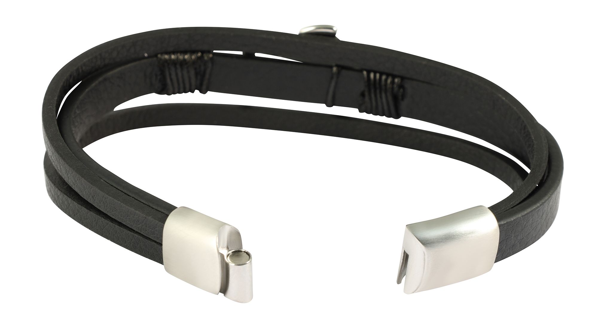 De Artur-armband van zwart imitatieleer is een accessoire met zilverkleurige roestvrij stalen elementen. Verschillende kunstlederen elementen met verschillende oppervlaktestructuren zorgen samen voor een harmonieus en modieus totaalbeeld.