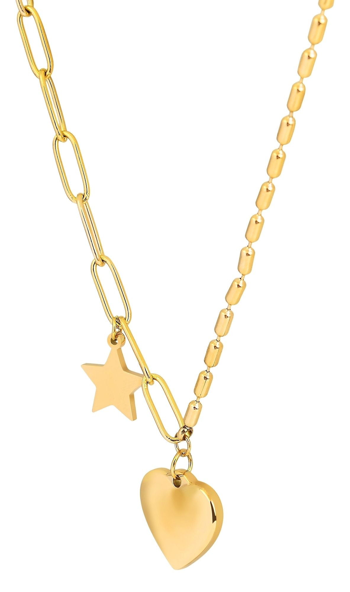 De roestvrijstalen ketting van het merk Akzent is een hoogglans gepolijste damesketting die verkrijgbaar is in verschillende kleuren. De ketting is 43 cm lang, 2,5 mm dik en 4 mm breed. Het bijzondere aan deze ketting is dat hij bestaat uit twee verschillende soorten kettingen. De eerste helft van de ketting is een lange krulketting, de tweede helft is een bolletjesketting gemaakt van langwerpige elementen. Deze zijn verbonden met een hartvormige roestvrijstalen hanger van dezelfde kleur, die gegraveerd kan worden. De afmetingen van de hanger zijn 16 mm lang, 18 mm breed en 4,5 mm dik. Aan de lange gepantserde ketting is ook een stervormige hanger bevestigd. Deze is 11,5 mm breed en 1,5 mm dik. De ketting kan worden verlengd tot 5 cm en kan worden geopend en gesloten met een karabijnsluiting.