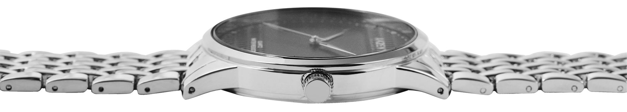 Het analoge herenpolshorloge met 3 wijzers van het merk Akzent Exclusive heeft een hoogwaardig kwartsuurwerk. De metalen armband is 22 mm breed bij de lug en kan worden geopend en gesloten met een clipsluiting. De totale lengte van het horloge is 22 cm. De metalen kast met mineraalglas heeft een diameter van 42 mm en een kasthoogte van 9 mm. De achterkant van de kast is gemaakt van roestvrij staal en het horloge heeft een waterdichtheid van 3 bar. Een visueel hoogtepunt is de wijzerplaat, die is versierd met een subtiel driehoekig patroon op zes en twaalf uur. Er zijn ook twaalf puntmarkeringen op de wijzerplaat en extra lijnmarkeringen op twee, drie, vier, acht, negen en tien uur. De wijzers en indexen hebben dezelfde kleur en passen goed bij de algehele look van het horloge.