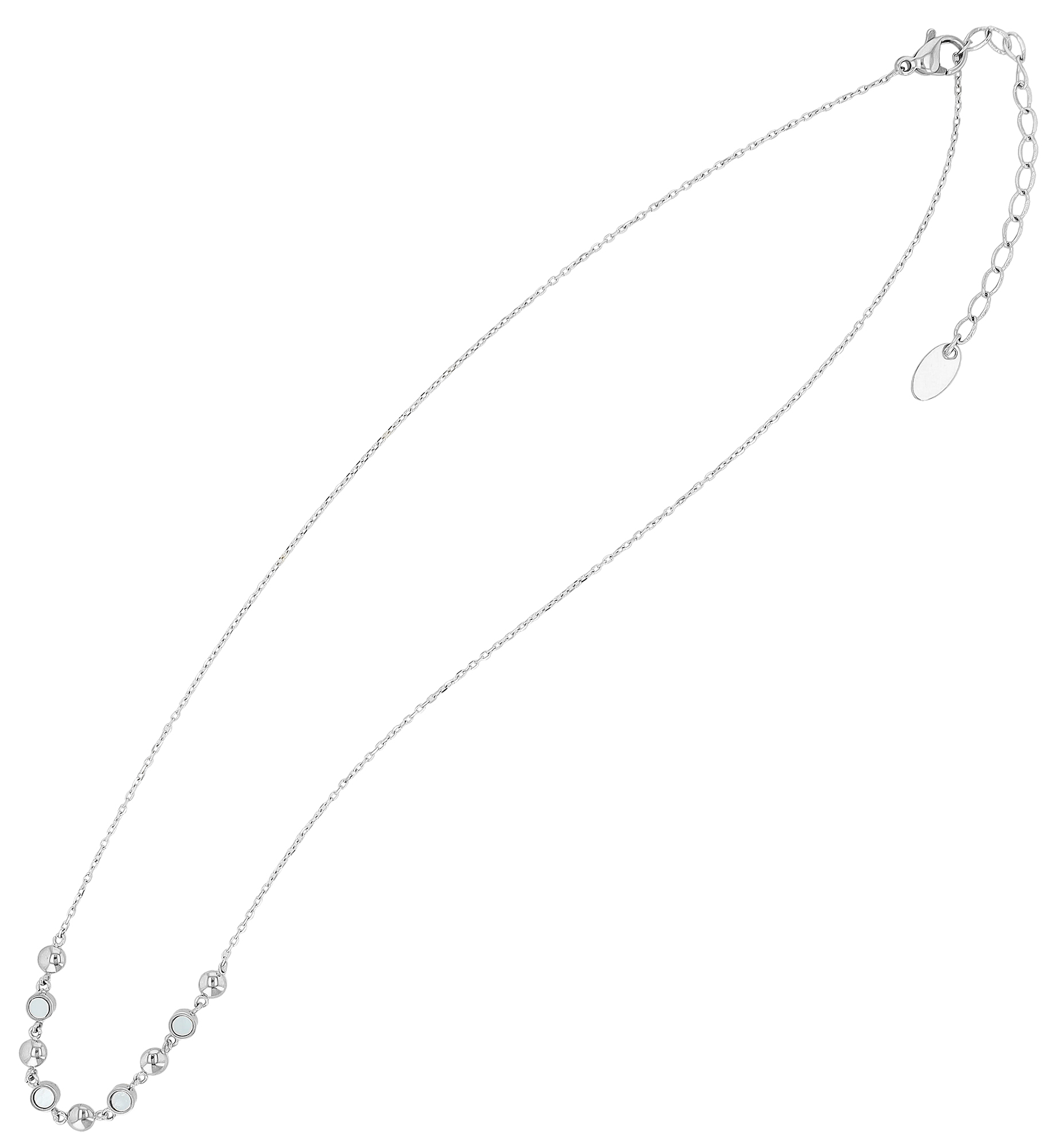 Deze stijlvolle roestvrijstalen ketting combineert kostbaar parelmoer met hoogwaardige roestvrijstalen elementen over een lengte van 6 cm. De fijn bewerkte elementen (Ø 4 mm) geven het sieraad een subtiele maar expressieve uitstraling. Verkrijgbaar in twee versies, zilverkleurig met een kettinglengte van 41 cm en goudkleurig met een kettinglengte van 42 cm. De lengte kan worden aangepast dankzij de extra verlenging van 5 cm. De praktische karabijnsluiting zorgt voor een stevige grip. Deze ketting is de perfecte metgezel voor elegante en alledaagse looks.