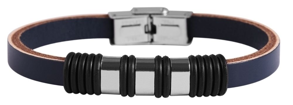 De echt lederen armband van het merk Akzent is gemaakt van een 10 mm brede lederen band die op het breedste punt 13 mm meet en verkrijgbaar is in zwart, blauw of bruin. Het midden van de armband is versierd met drie zilverkleurige roestvrijstalen elementen, gezet in 14 discrete zwarte rubberen ringen die het design van de armband afronden. De roestvrijstalen ringen zijn groot genoeg om te personaliseren met kleine gravures.