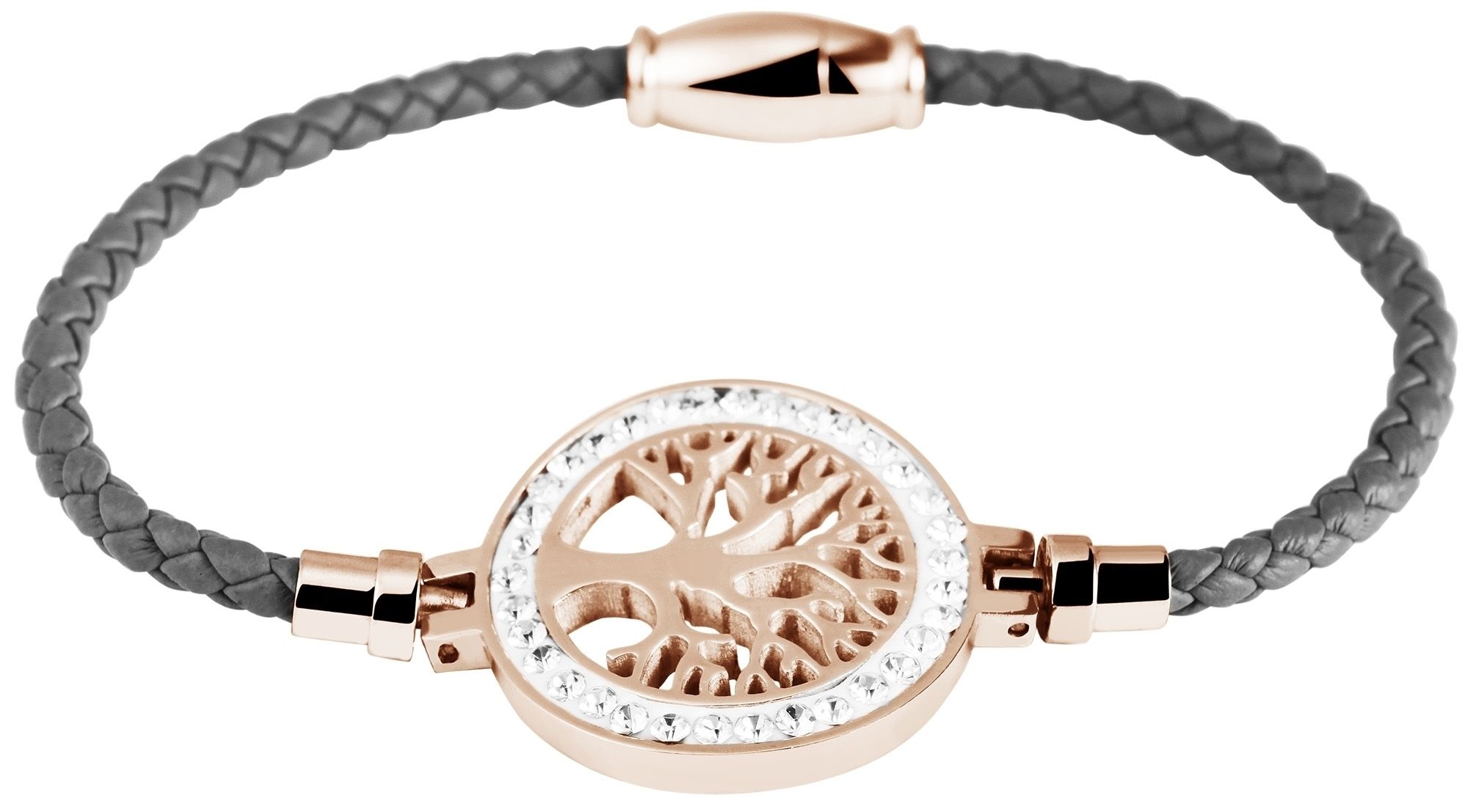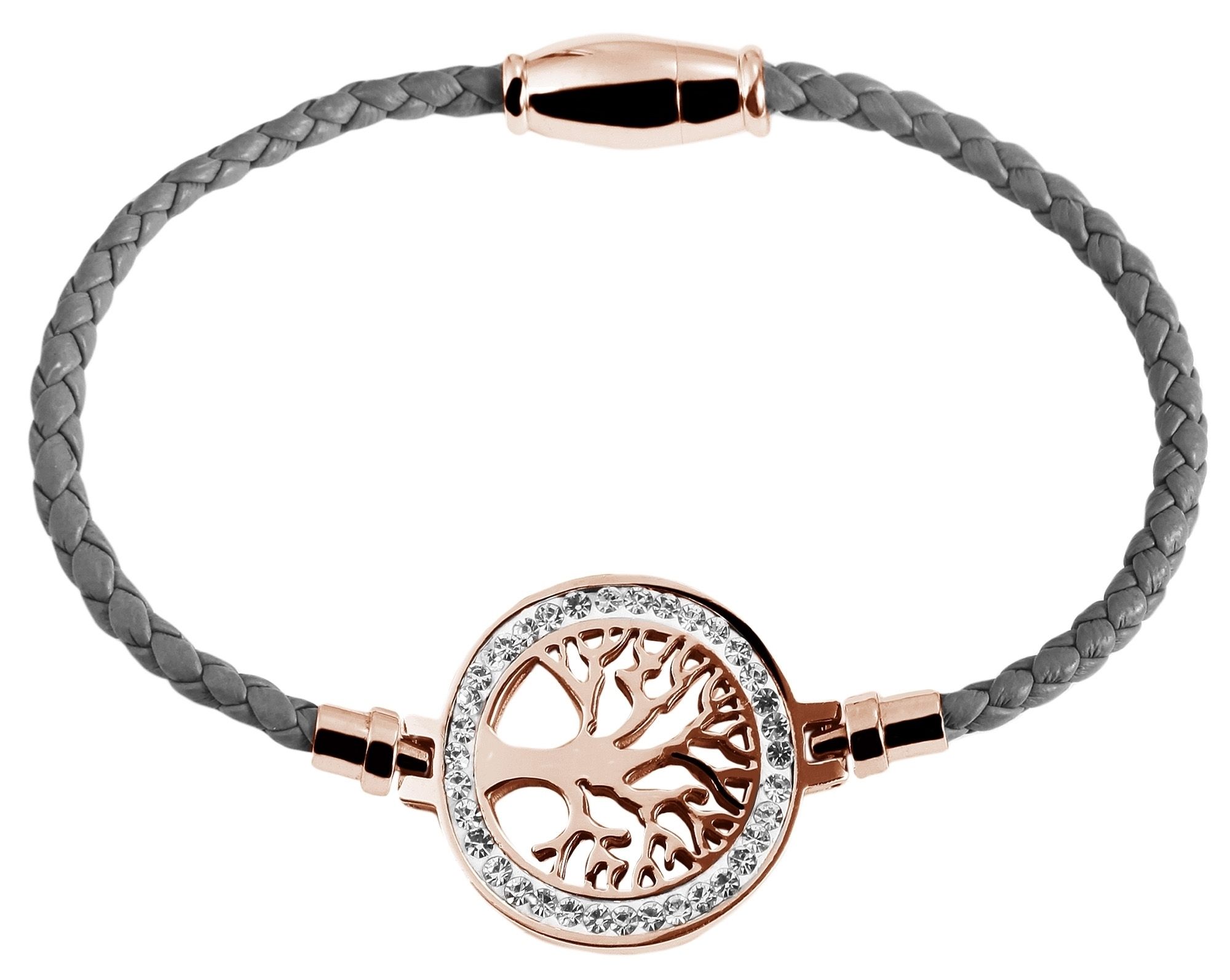 Productinformatie "Akzent Armband aus Lederimitat, geflochten mit Edelstahlelement Lebensbaum, grau/roségoldfarben"
