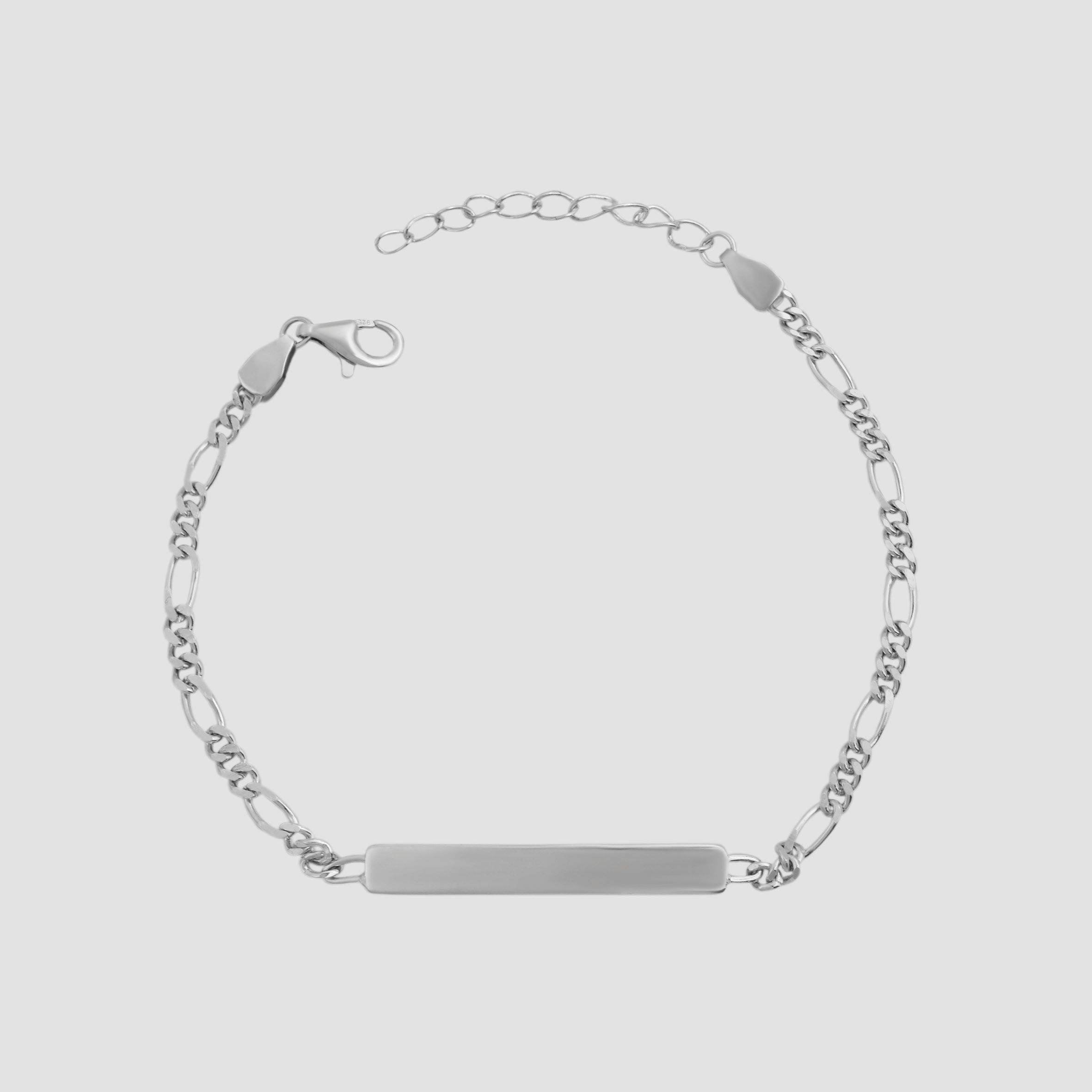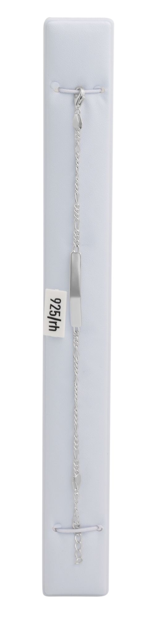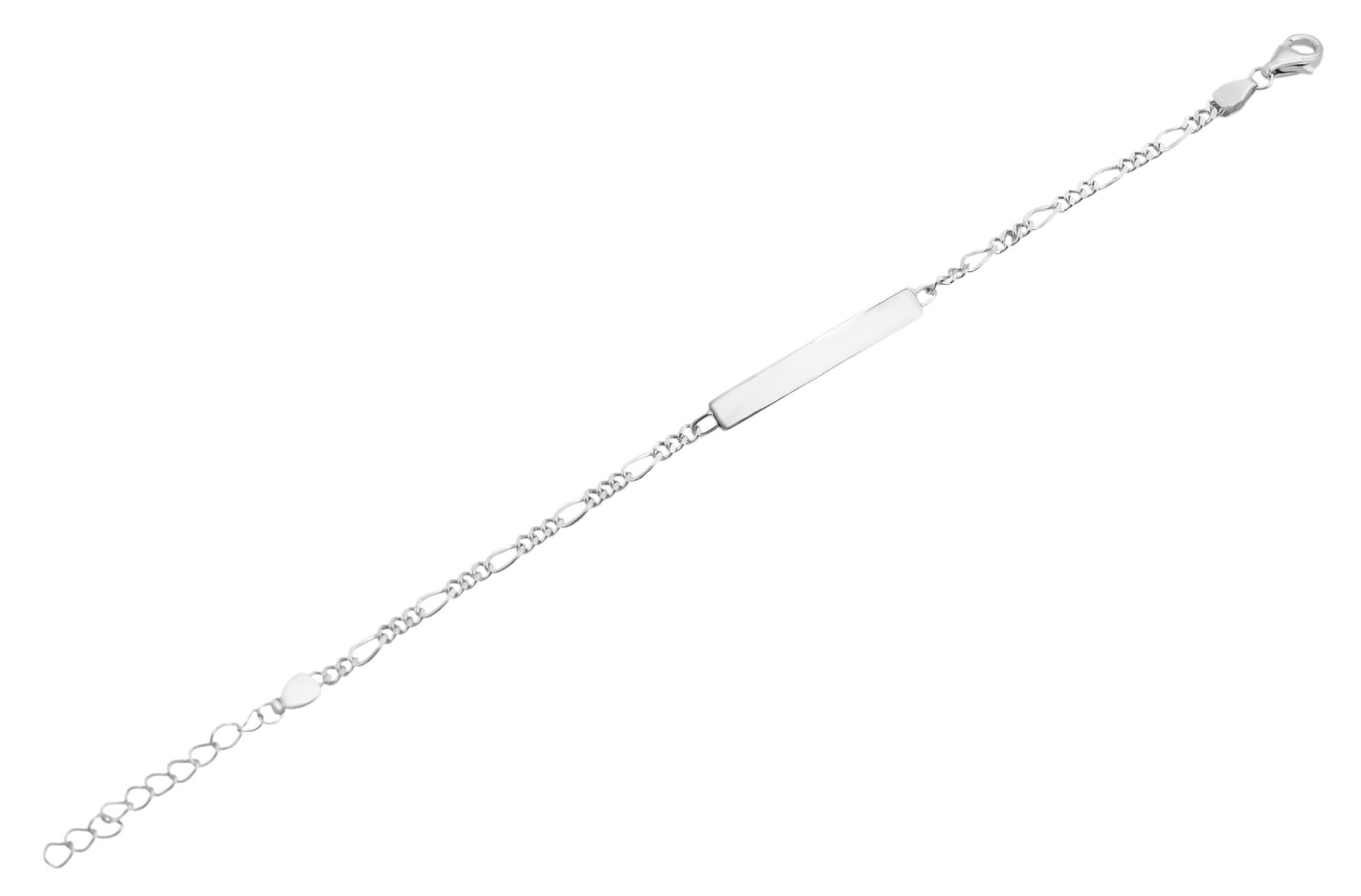 De armband in het Figaro kettingpatroon met geïntegreerd ID-plaatje is gemaakt van 925/- sterling zilver en is bovendien afgewerkt met een rhodium coating. Deze coating beschermt het materiaal tegen aantasting en zorgt ook voor een stralende glans. De ID-band is geschikt voor allerlei gravures, zodat je de eenvoudige band een persoonlijk tintje kunt geven. De band is verkrijgbaar in verschillende lengtes en kan met 3 cm worden verlengd. Het graveerplaatje is 22 mm lang, 4 mm breed en 1 mm dik.