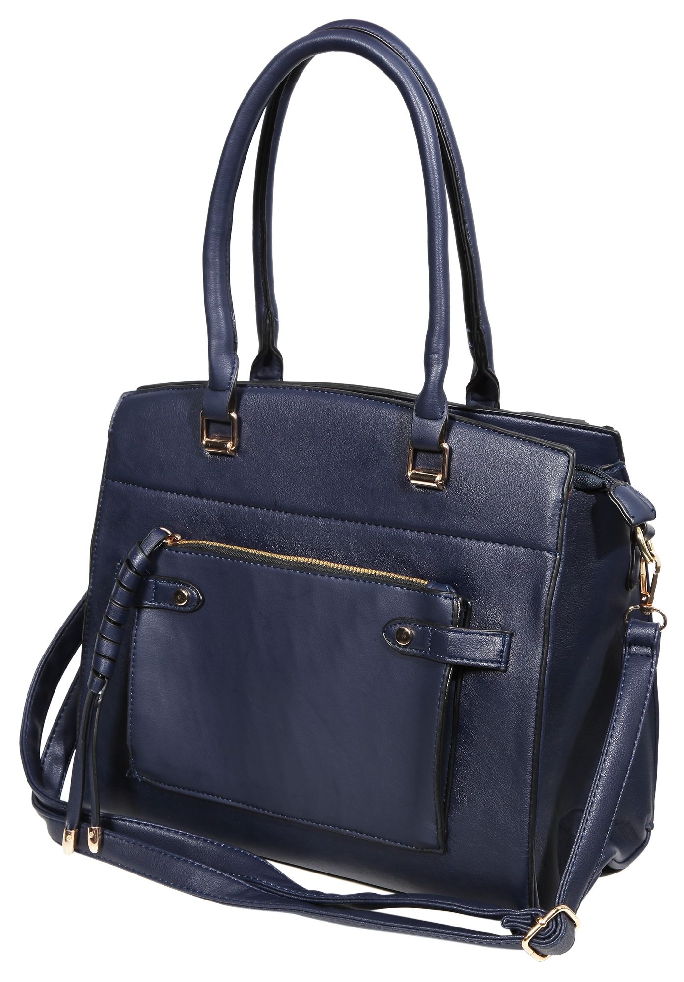 De dameshandtas is gemaakt van imitatieleer en het hele oppervlak heeft een gladde textuur. De tas heeft twee korte hengsels en een lange, afneembare schouderriem. De handvatten zijn bevestigd aan kleine metalen oogjes aan beide zijden van de tas. Er is een plat buitenvak in het midden van de voorkant van de tas. Er zit ook een rits aan de achterkant van de tas, die een vak verbergt voor kleinere spullen. De tas heeft een groot hoofdvak dat geopend kan worden met een rits. Binnenin zijn er twee open binnenvakken achter de voorkant en een smal, afsluitbaar binnenvak achter de achterkant.