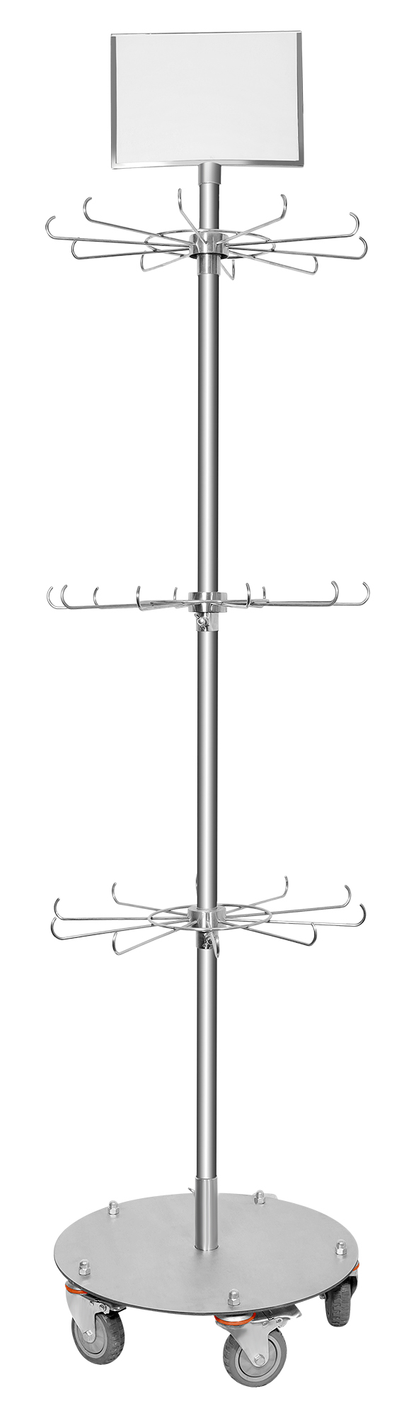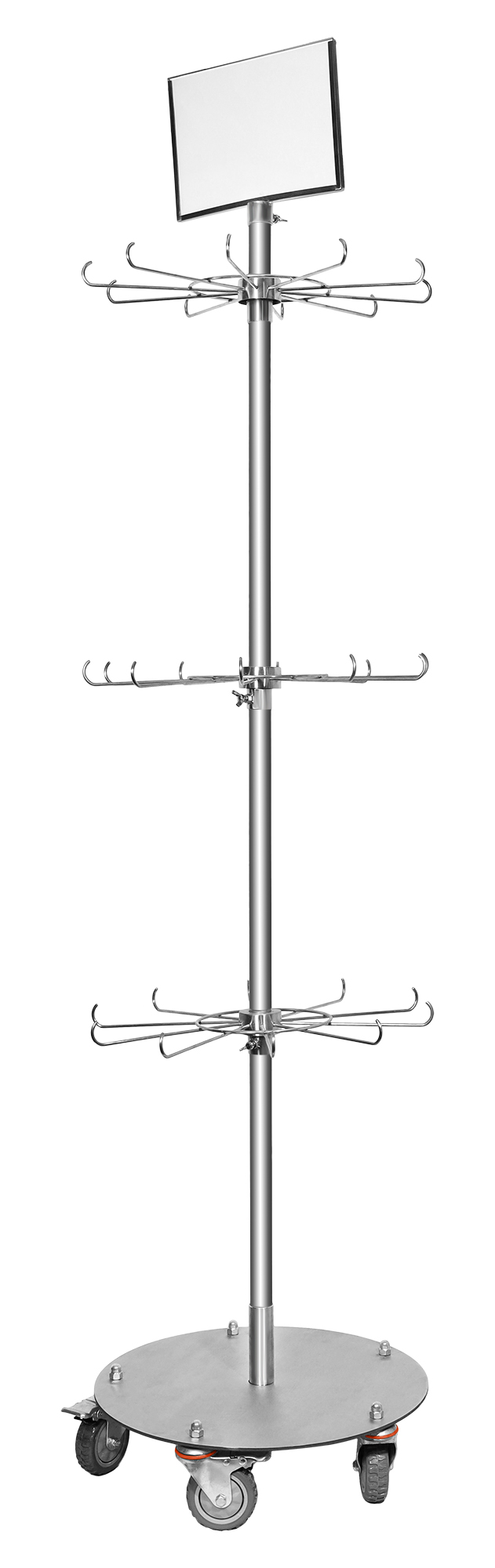 Een veelzijdige roestvrijstalen displaystandaard met een hoogte van 210 cm en een ronde voet met een diameter van 50 cm waardoor hij stabiel staat. Voorzien van vijf stevige zwenkwielen (Ø 10 cm)met parkeerrem om de standaard stevig op zijn plaats te houden.