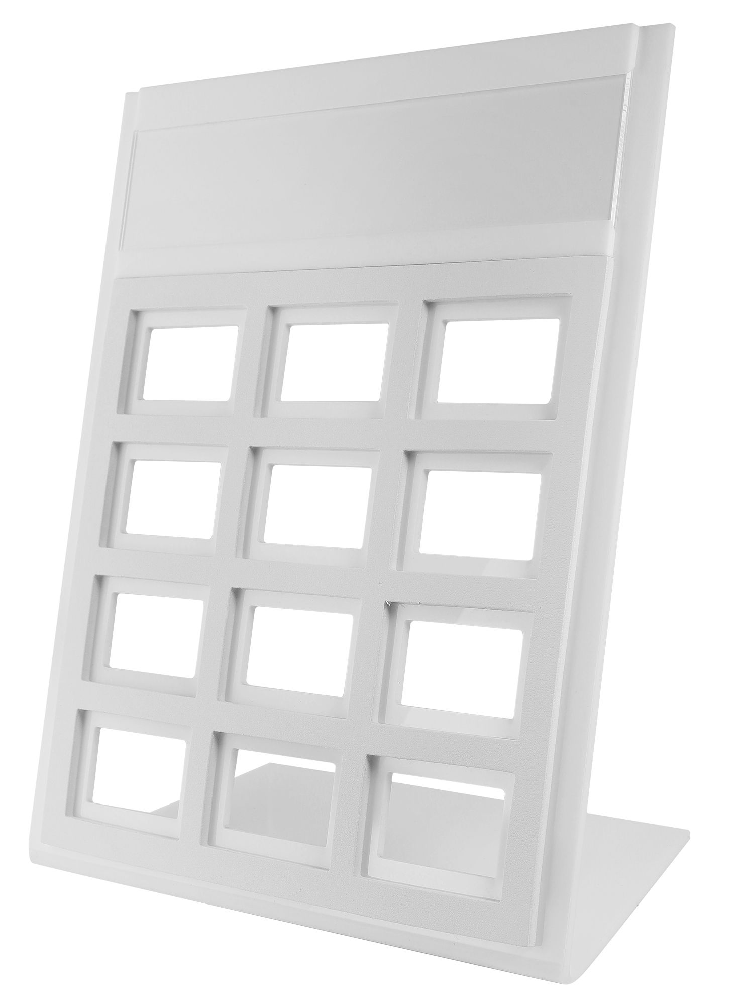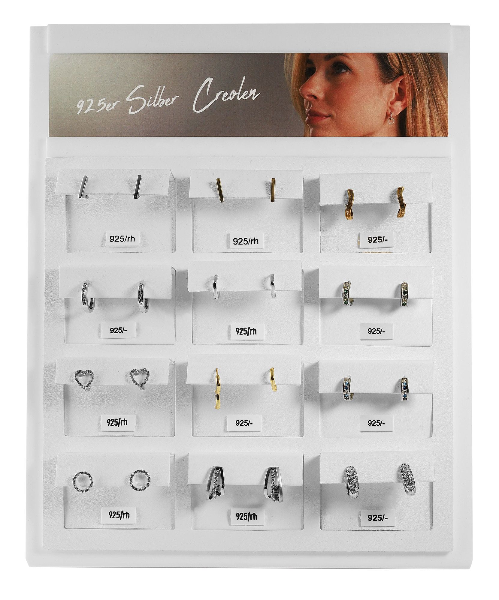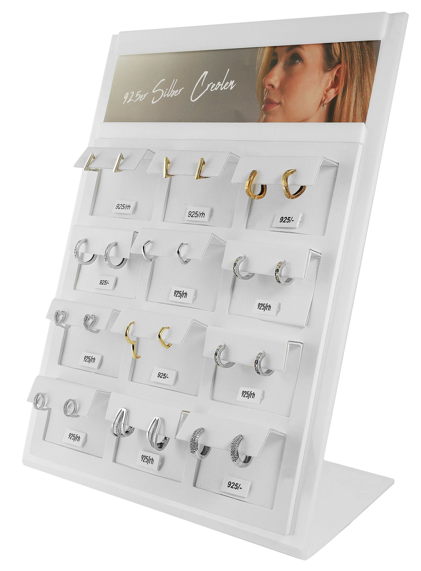 Präsentieren Sie Ihren Schmuck perfekt und ansprechend mit unseren hochwertgen Schmuckdisplay aus weißem Kunststoff. Die klare, stilvolle Optik dieser Displays lenkt den Fokus auf Ihren Schmuck und setzt diese auf der Ladentheke oder im Schaufenster gekonnt in Szene. Jedes Displays hat im oberen Bereich die Möglichkeit für eine einseitige Einlagenbeschriftung z.B. ein individueller Schriftzug oder ein passendes Bild zum präsentierten Schmuck.