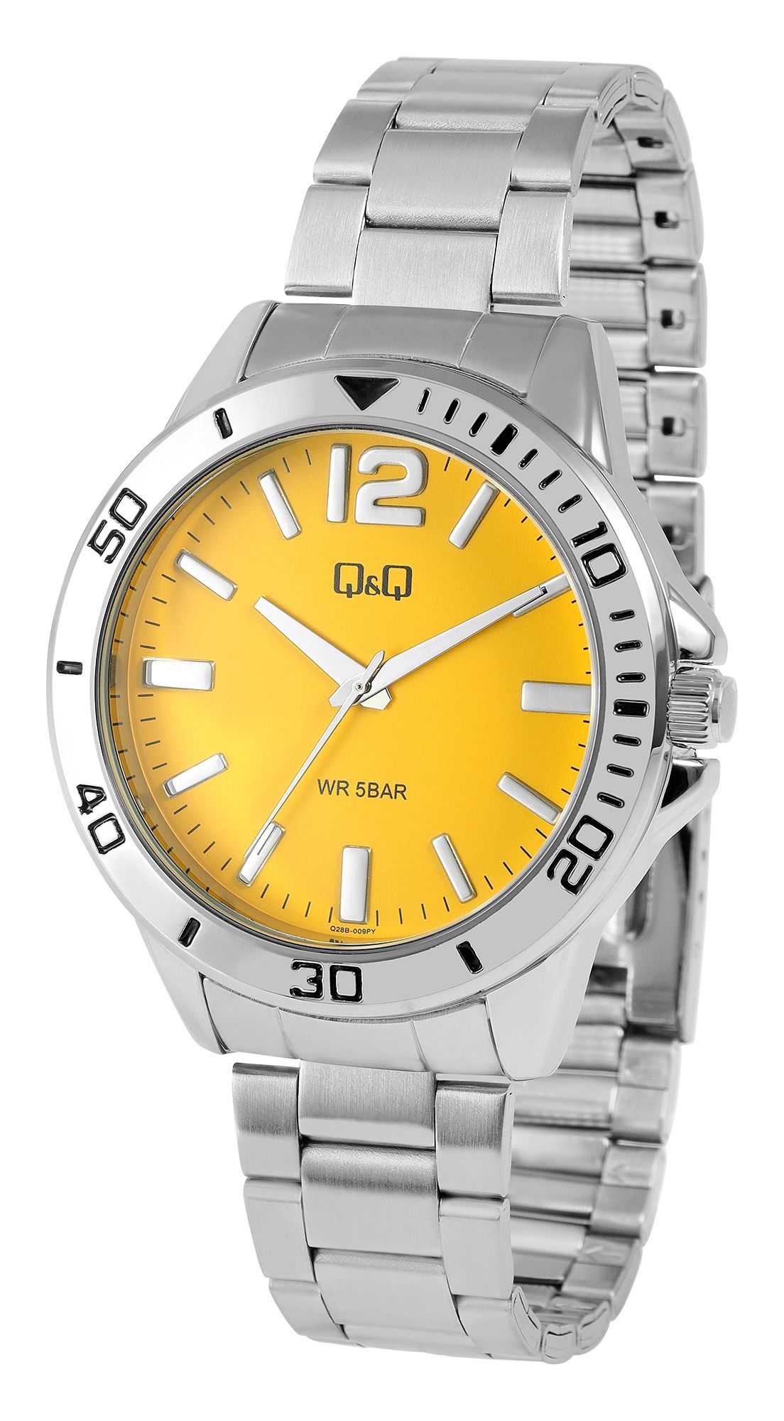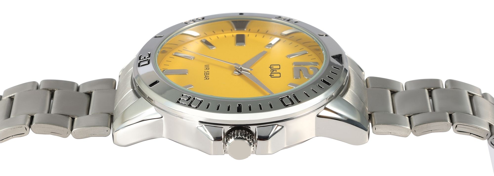 Productinformatie "Q&Q Herrenuhr, Edelstahlarmband, silberfarben/gelb, 5 ATM, Ø 44 mm"