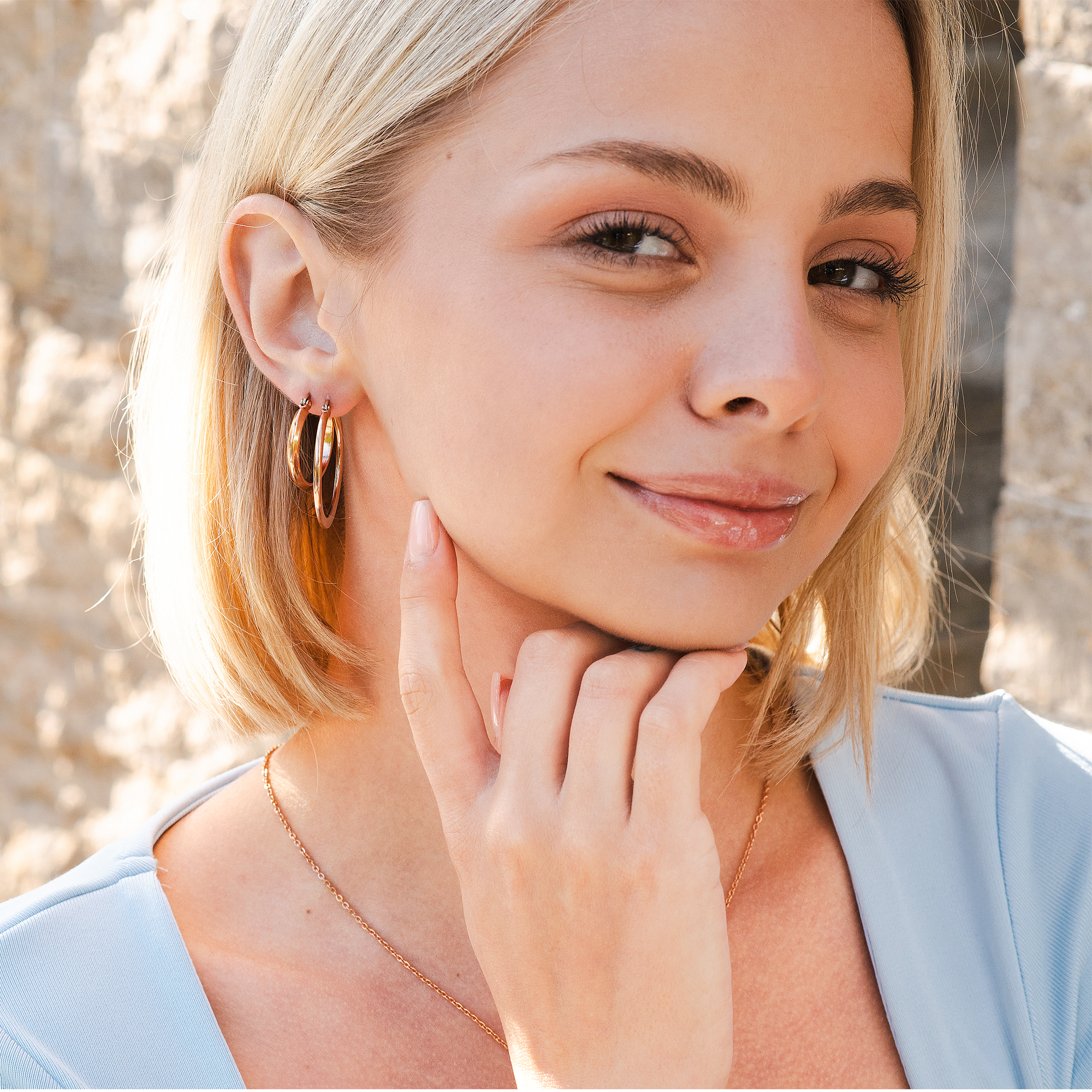 Die Creolen der Marke Akzent, bestehend aus einem Set mit drei Ohrringpaaren, wurden aus Edelstahl gefertigt und sind roségoldfarben. Das Material ist sehr robust, langlebig und eignet sich ideal für Allergiker, da sich Edelstahl als besonders hautverträglich erweist. Zusätzlich ist der Schmuck mit einer hochwertigen Ionenplattierung veredelt. Die Creolen sind poliert und erstrahlen dadurch in einem besonderen Glanz. Das Set beinhaltet Creolen in verschiedenen Designs mit jeweils einem Durchmesser von 19 mm, 20 mm und 26 mm. Somit haben Sie zu jedem Outfit und jeden Anlass den perfekten Ohrschmuck in Ihrer Schmucksammlung parat.