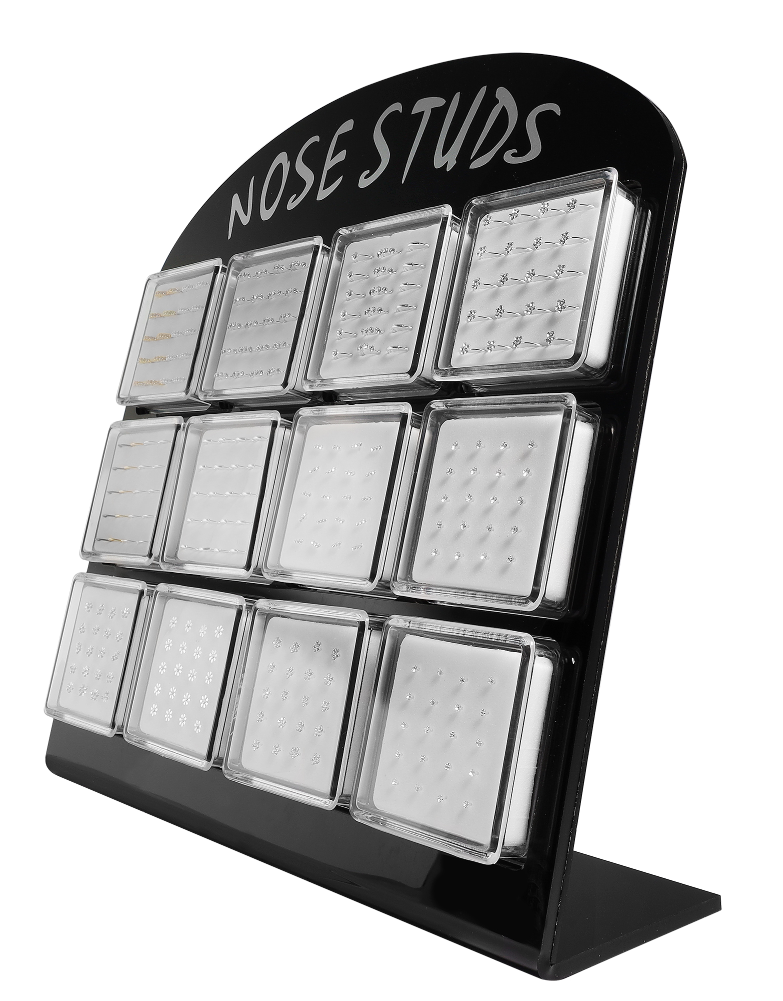 Het eenvoudige en tijdloze ontwerp van de display, met het opschrift "NOSE STUDS", past harmonieus in elke verkoopruimte.