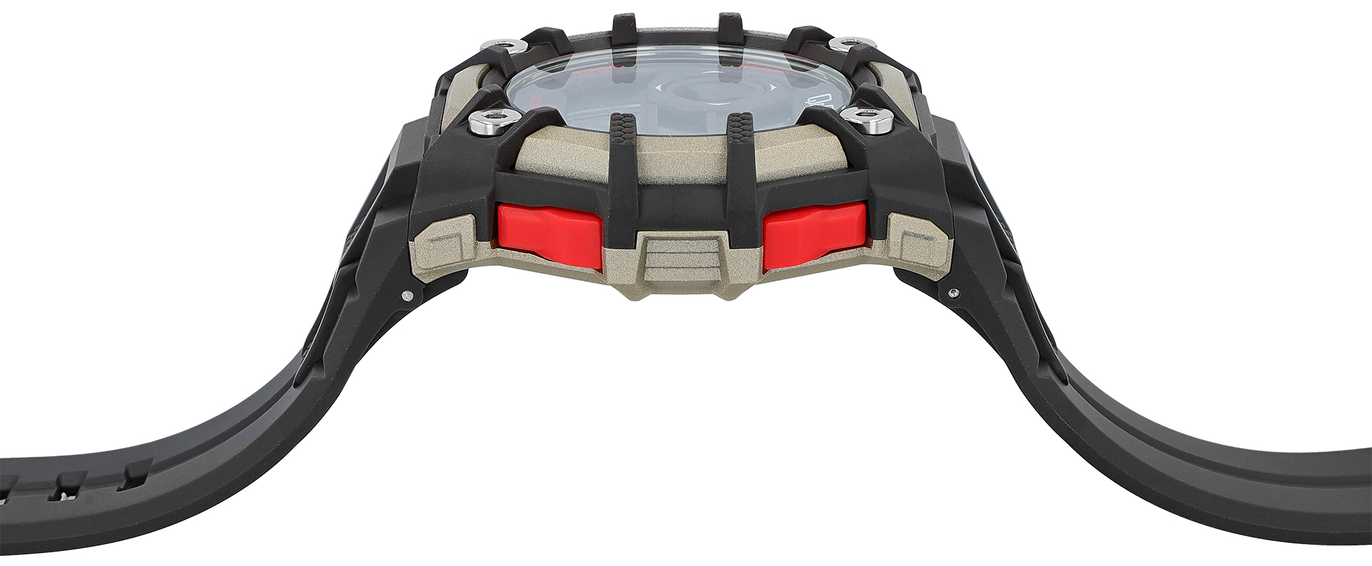 Die Gesamtlänge der Uhr beträgt ca. 24 cm, bei einer Gehäusebreite und -länge von jeweils 53 mm und 48 mm und einer Gehäusehöhe von 14 mm. Der Gehäuseboden ist aus Edelstahl gefertigt und an vier Seiten an der Ober- und Unterseite fest mit dem Gehäuse verschraubt. Das Glas ist aus transparentem hochflexiblem Kunststoff gemacht und sorgt somit auch bei einem erhöhten Druck für eine gute Adaption.