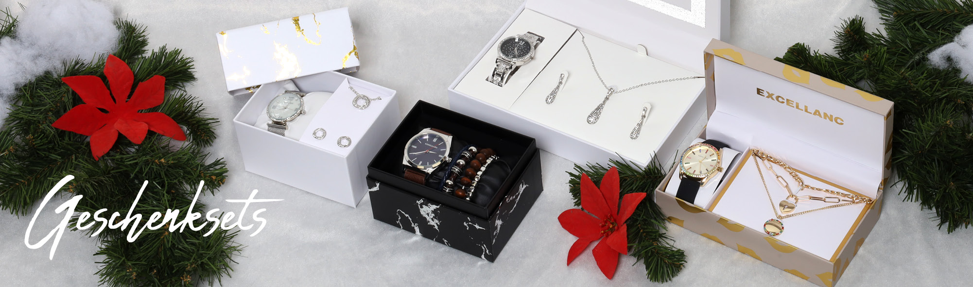 De geschenkset van het merk Excellanc bestaat uit een damespolshorloge, een halsketting, een paar oorstekers en een vingerring. Alle sieraden zijn zilverkleurig en het horloge heeft een zwarte wijzerplaat. Het patroon van een bloem is terug te vinden in de hanger van het collier, de oorstekers en de vingerring en maakt de harmonieuze combinatie van alle sieraden, die worden geleverd in een praktisch scharnierdoosje, compleet. Het bloemcentrum van de ketting is versierd met 19 simili-stenen, de oorstekers zijn elk versierd met zeven simili-stenen en de ring heeft een grote simili-steen. Hij is ook versierd met nog eens 14 simili-stenen op de ringband. De ring heeft ook een open ringband zodat de maat kan worden aangepast. De lengte van de ketting in bolpatroon is 57 cm inclusief een verlengkettinkje van 5 cm. Dit maakt het mogelijk om de lengte te variëren en de moderne sieradenketting aan te passen aan elke outfit. Het polshorloge is een klassiek 3-hands horloge met een hoogwaardig quartz uurwerk. Het heeft een lengte van 18 cm, een kastdiameter van 38 mm en een kasthoogte van 9 mm. De geschenkdoos is 14,8 cm lang, 21,5 cm breed en 5,8 cm hoog.