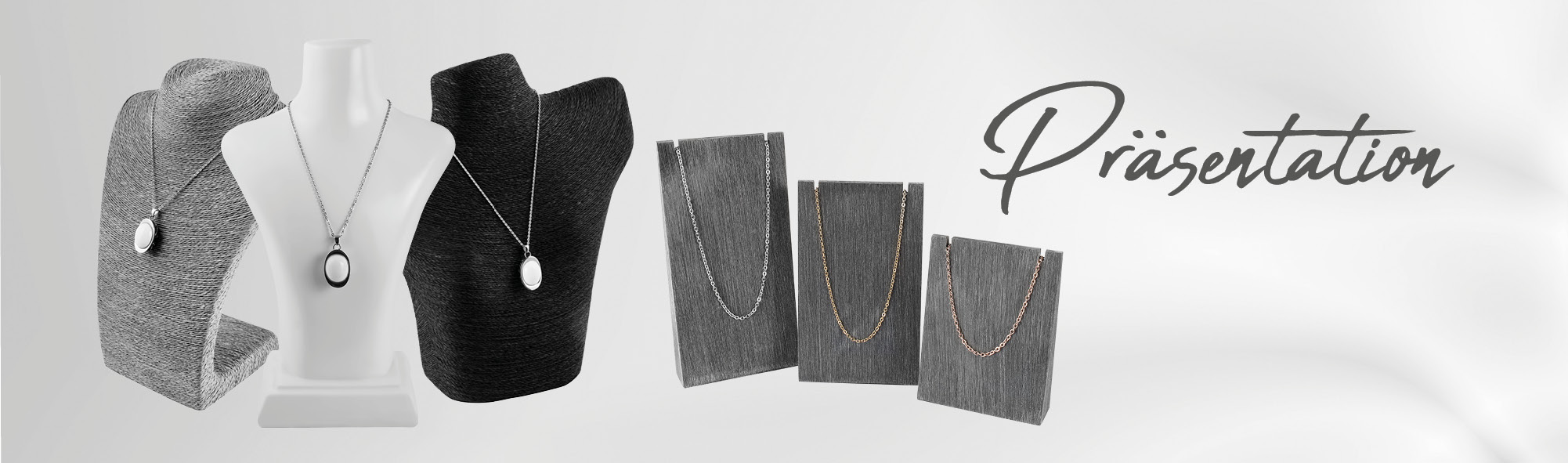 De serie is verkrijgbaar in zwart, grijs en wit, zodat u uw presentatie perfect kunt afstemmen op uw sieraden en de sfeer van uw winkel. De duurzame PU-coating beschermt uw sieraden en vestigt de aandacht direct op de producten.